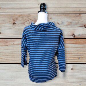 This black and blue striped top has a drawstring at the neckline that could be used as a hood. Made by Cynthia Rowley it is a size medium. Would look great with jeans or black leggings.