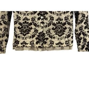 Women’s Cynthia Rowley black and cream floral button up, 100% merino wool cardigan. Lace trim detail around the neck and along the bottom hem. Item is in good, clean condition. There’s just a slight minor “hole” on the back. It’s not noticeable when worn. Please see last photo for more details. Pit to pit 17” / Length 23.” Smoke free home. Women’s size small