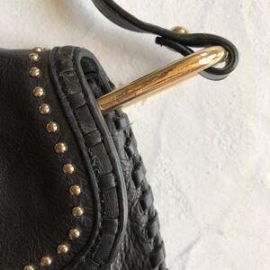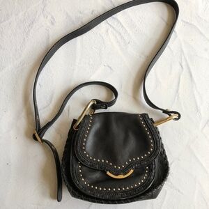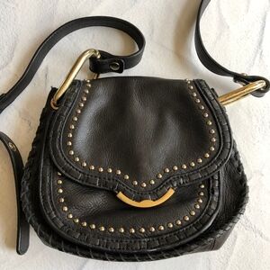 Cynthia Rowley Black Calf Leather Phoebe Crossbody Saddle Bag with gold tone studs and whipstitch trim. Used condition with some wear to hardware and marks in the interior as shown in photos. Adjustable shoulder strap, 21.5" drop. Flap top with snap closure. Slip pocket under flap.