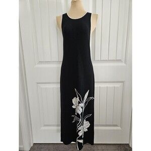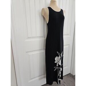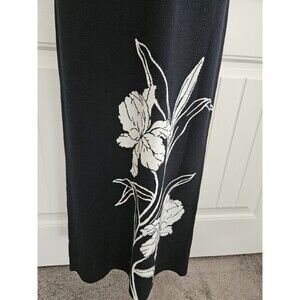 This Cynthia Rowley Black & White Viscose Sheath Maxi Dress in size S is a stylish and versatile piece perfect for various occasions. The sleeveless dress features a floral pattern in black and white, a scoop neckline, and a pullover closure for easy wear. Made of a blend of viscose and polyester knit fabric, the long dress offers a comfortable stretch for a flattering fit. Suitable for travel, weddings, parties, casual wear, and workwear, this dress by Cynthia Rowley exudes elegance and sophistication for the modern woman.