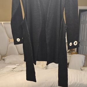 Elegant black trench coat. Features cream floral accents. Belted waist for a flattering fit. Perfect for stylish outings. Very good condition.