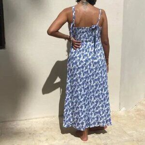 Cynthia Rowley Blue White Flower Printed Casual Summer Midi Dress - Straps can be tied on top of shoulder or on back of dress, Blue and White boho cottagecore floral print, Smocked back panel, Lined. Sleeveless, V neck, Midi dress, Side zip closure. Tags - Church, summer, wedding, modest, event, holiday, Christmas, party, birthday, date night, Valentine's day, etc.