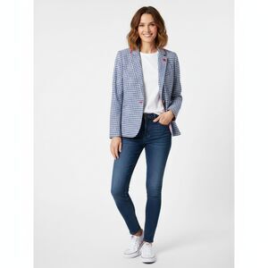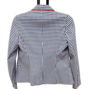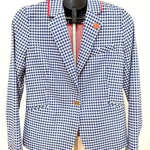 Keywords: Gingham, Blazer, CynthiaRowley, Preppy, Nautical, Coastal, Check, Jacket, StripedLining, BusinessCasual.