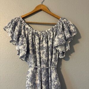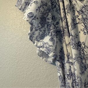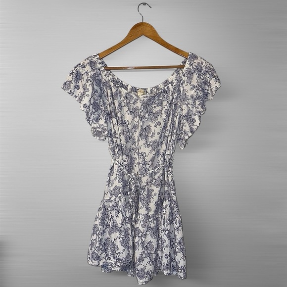 Chic mini dress with blue floral design. Features flutter sleeves. Ideal for casual outings.