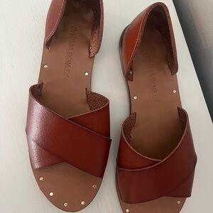 Like new. Only worn once. Chic brown leather sandals with crisscross design. Ideal for casual outings.