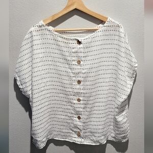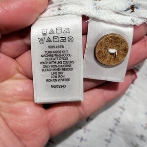 Charming and lightweight Cynthia Rowley top crafted from 100% linen, featuring an allover bumble bee print with a relaxed, airy silhouette. Designed with natural wooden buttons and an easy boxy fit, this breathable linen blouse is perfect for warm weather, vacations, and casual everyday wear with a polished twist.