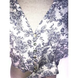 This romantic cottage-core blouse is a great transition piece. It is a linen blend button-down style blouse. It has a cropped cut and a front tie. The sleeves have a slight puff and are quarter-length with cinching to add structure. The shell buttons give a vintage feel to this classic English-style blue floral print. New with tags.