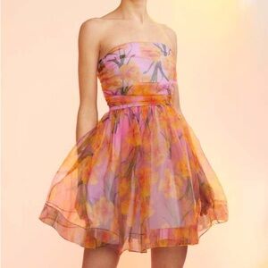 Daffodil printed strapless organza dress. Layered organza strapless top. All over daffodil print. Gathered tier at waist. Fully lined. Exposed contrasting back zipper. Ballerina inspired skirt. Mini length.