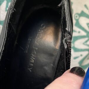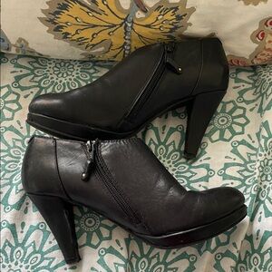 Chic black ankle boots with a sleek design. Features a comfortable heel with slight platform and side zipper. Ideal for stylish outings. Shows signs of wear on heels and toes, slight peeling and heel cap wear. Genuine leather has lots of life left. Size 7.5.