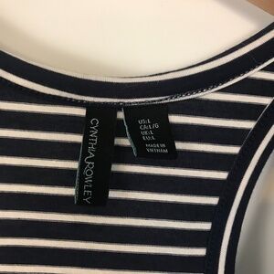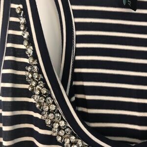 In excellent pre-owned condition! Only worn once! Cynthia Rowley racerback tank top in navy and white stripes and embellished / jeweled neckline. Size L, measuring 19” across the chest and 23” in length. Flares out slightly at bottom.