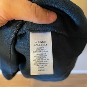 This is a great dress! Classic navy blue with a slight twist: a faux wrap front with a buckle accent. Made by Cynthia Rowley. V-neck sleeveless dress with stretch. Hits above knee. Made of 55% cotton/42% polyester/3% spandex. Measurements in photos. Machine washable. Knee length. Size Large. In excellent pre-loved condition.