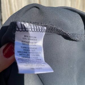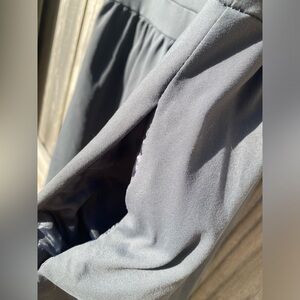 Elegant gray dress with stylish studded straps. It is a slate gray with targa back. The silver finishing around neckline is front and back. The dress as has pockets!