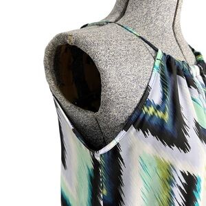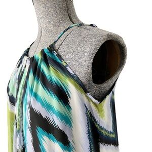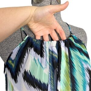 Cynthia Rowley High Low Colorful Geometric Print Halter Dress. Size 6. In good preowned condition with one small snag to the chiffon fabric near the bottom hem (see circled pic). Colorful blue, green and periwinkle geometric allover print. Halter neckline that ties in the back. Skinny straps. Lined underneath.