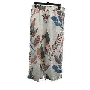 Pull on white linen pants from Cynthia Rowley. Featuring a colorful tropical doodle print allover. Stretchy, elastic waist. 2 pockets. Cropped length. Wide leg style. Unlined, may not be completely opaque. 100% linen. Machine wash. In preowned condition.