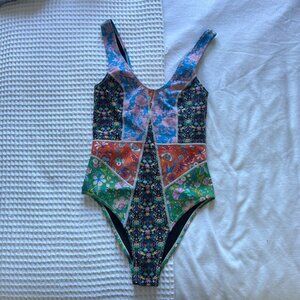 In excellent used condition. Unique floral print patchwork one piece swimsuit from Cynthia Rowley.
