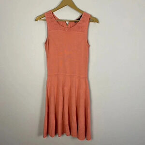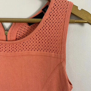 Coral color Knit with crochet detail Back zipper Fabric tag is missing Excellent preowned condition Size small