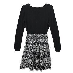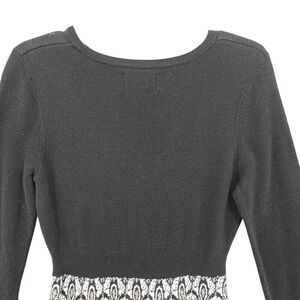 Cynthia Rowley's knit sweater dress combines a black top with a patterned skirt in a sophisticated fit and flare design, perfect for any wardrobe.
