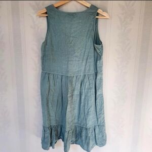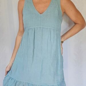 Chic light blue midi dress with a sleeveless design. Features a flattering V-neck and tiered hem. Perfect for casual outings.