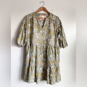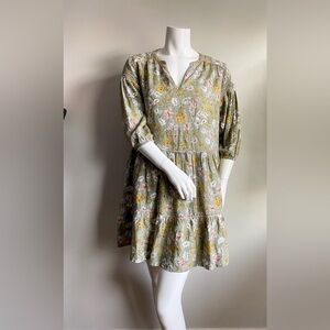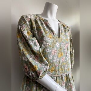 Cynthia Rowley Linen Babydoll Dress Puff Sleeves Floral Boho Green Pink Resort M