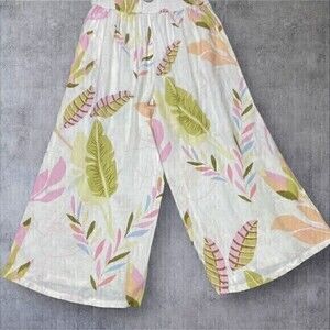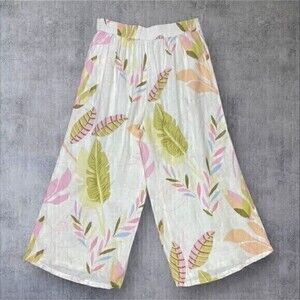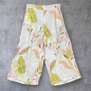 Cynthia Rowley Linen Pants Womens L Cream Tropical Print Wide Leg Crop Pull On