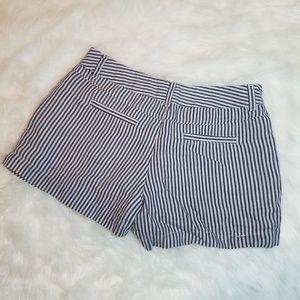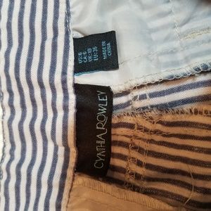 Cynthia Rowley Linen Railroad Striped Shorts blue and white, 100% linen shorts and a women's size 6. Has a cute wooden button , and vertical stripes. Waist measurment is about 15 inches laid flat or a 30 waist and rise is about 9 inches. In good used condition with no major flaws or blemishes. Bundle with other items from my closet for a special discount!