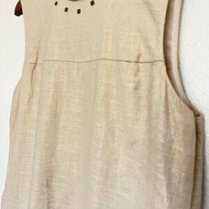 Elevate your wardrobe with the timeless elegance of this Cynthia Rowley Maxi Dress, perfect for making a sophisticated statement at work or tranquil evening events. Crafted in a luxurious blend of linen and cotton, this dress boasts breathability and comfort. Its neutral beige hue offers a versatile palette that complements a variety of accessories and shoes. The sleeveless design features a crew neckline adorned with unique stud detailing that adds a hint of edginess to the classic silhouette. The size 14 fit is tailored to flatter with a flowing maxi length, ensuring you move with grace. Ideal for the career-oriented woman with an eye for style, this piece effortlessly transitions from day to night. Pair this chic garment with your favorite heels and statement jewelry to complete a look that's both classy and captivating.
