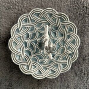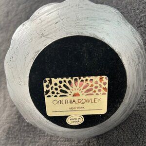 4-1/2"w x 3-1/2"h blue green enamel jewelry dish by Cynthia Rowley of New York. Features metal bird on a tree. Weighs over 10 ounces.