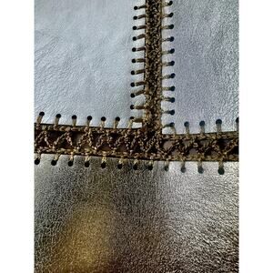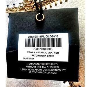 Cynthia Rowley's miniskirt is adorned with a metallic patchwork and faux leather featuring intricate stitch detailing, adding a touch of versatile elegance to the wardrobe.