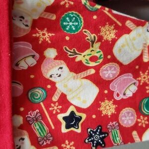 Cute marshmallow snowgirl with cocoa, candy canes and candy print on red bottoms