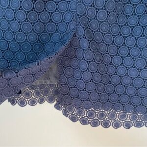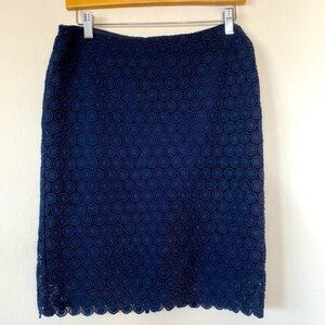 Great skirt for work, church or going out. Navy blue with eyelet overlay. Skirt is fully lined and has a kick slit in the back. Size 4