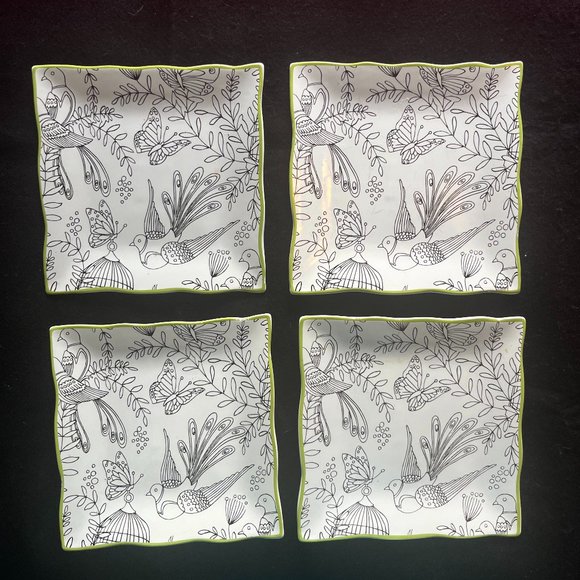 This is a set of 8” x 8” luncheon plates designed by Cynthia Crowely have a cremy white background. The design is outlines of birds, butterflies and leaves in black. It isn’t filled in which gives it a distinctive look. The edge is trimmed in deep celery green that highlights the design.