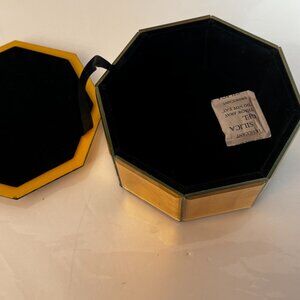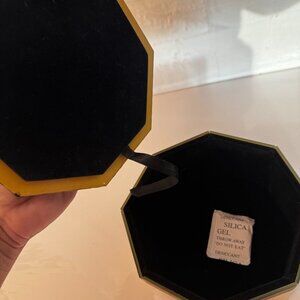 Cynthia Rowley New York Mirrored Beveled Glass Jewelry Trinket Box Golden Octagon Black Velvet Interior. Pre-owned item in good condition, has slight wear as you'd expect from a used item. Beautiful Jewelry Trinket box, great gift. Please use the zoom feature to determine shape and condition, check all pictures and measurements carefully for detailed viewing as they are part of the description and help you with your purchase. I invite you to always check my new listings, buy with confidence. Smoke free home. Thank you, have a wonderful day!!