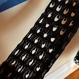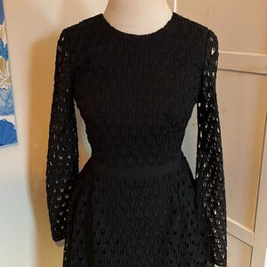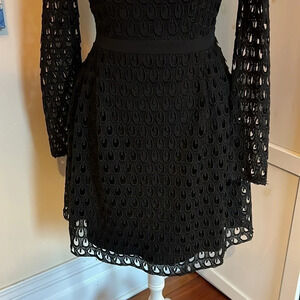 Gently used, Cynthia Rowley black special occasion dress. This stunning dress has an open back with a button closure at the neck and a zip closure on the skirt. This dress is in a beautiful eyelet fabric that is lined on the bodice and skirt.