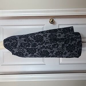 Long Sleeve, Open Front Coat, Wool and Viscose, Gray With Raised Black Floral Print, Excellent Condition, Size Medium.