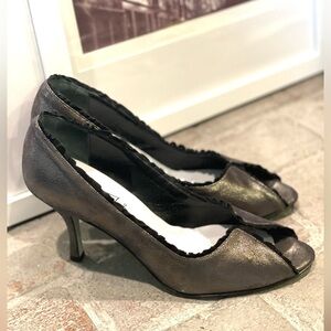 Cynthia Rowley Geist NYC peep toe heels metallic leather with suede ruffle trim women's size 9.5