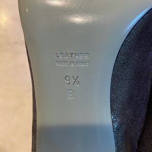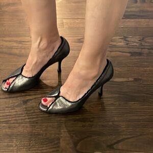 3" heel color-metallic gray/pewter crackled metallic leather dark silver suede ruffle. Excellent preowned condition, worn one time. True to size.