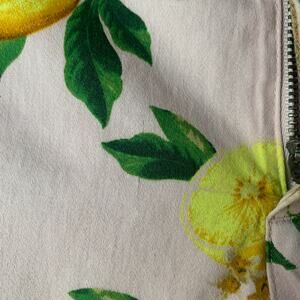 Pink chino shorts with yellow lemons, green leaves, and beige flowers. The shorts have belt loops along the waistband, a zipper with a hidden button and hook and bar front closure, front diagonal pockets and back slit pockets. It is pre-owned with light fading and a couple of very small spots; by the zipper, bottom back left leg, and a fine line to the right of the zipper.