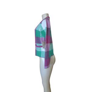 This Cynthia Rowley plaid cardigan sweater offers a classic yet vibrant design, featuring gold buttons for a touch of elegance. Made from quality materials, its plaid pattern combines multiple colors to enhance your wardrobe. Suitable for professional settings, its comfortable fit and stylish appearance make it a versatile choice. The cardigan is in nice shape, new with tags. 5 metal gold buttons down the center with pockets. 50 percent rayon, 30 percent polyester and 20 percent nylon in size small.