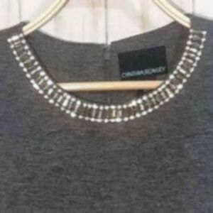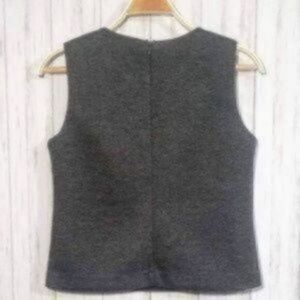 Charcoal gray sleeveless top with rhinestone embellishments across the scoop neckline. Concealed zipper down the back. Soft & lightweight feel. Fully lined. There are 4 missing rhinestones, however it is very hard to notice. Otherwise Great Condition.