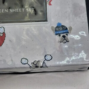 Cynthia Rowley Queen Sheet Set with Two Pillowcases Dogs Hats Winter Snow
