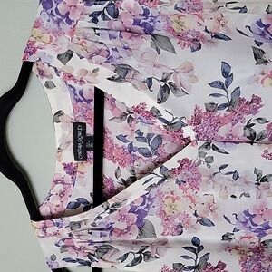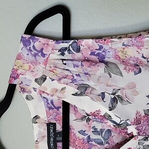 Sheer fabric. Split neck. White with soft pastel pink and purple florals all over. Great for the office. Gorgeous spring colored blouse. Excellent condition. High low style. Would need a tank or cami underneath. Garden, dainty, feminine, girly, spring, summer, office, workplace, dressy, career, brunch, church, dopamine