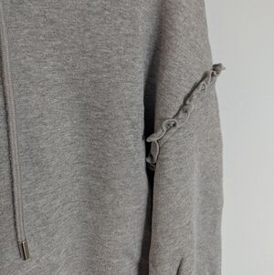 Soft gray women's hoodie sweater with a cropped fit. Features subtle ruffle seam detail on sleeves and adjustable drawstring hood. Lightweight knit for everyday comfortable wear.