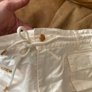 Cynthia Rowley's miniskirt is crafted of a smooth, silk blend and features 5 puffed cargo patch pockets. Belt loops and a drawstring waist complete this mid-rise style.