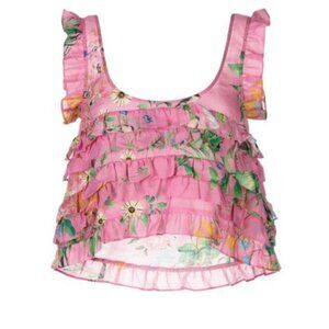 ruffled sleeveless blouse from CYNTHIA ROWLEY featuring deep pink, multicolour, ramie, all-over floral print, ruffled detailing, scoop neck, scoop back, sleeveless, curved hem and cropped. Conscious: This item contains at least 50% low-impact materials, which are certified or widely recognised as having a lower environmental impact.