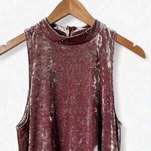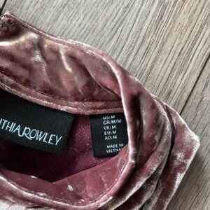 This Cynthia Rowley mini dress is a beautiful dusty rose crushed velvet. It’s sleeveless with an A-line silhouette and a halter-style mock turtleneck. This dress is perfect for holiday parties, weddings, or simply embracing a playful 90s aesthetic with its flowy and feminine style.