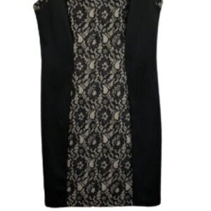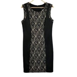 Lovely sleeveless black lace fitted sheath dress. Cream underlay. Scoop neckline. Stretchy. Features panels of black contrast on both sides for a very flattering look. Concealed zipper. Fully lined. Perfect for work, date nights and cocktail parties!!