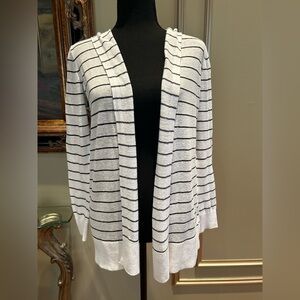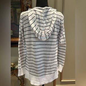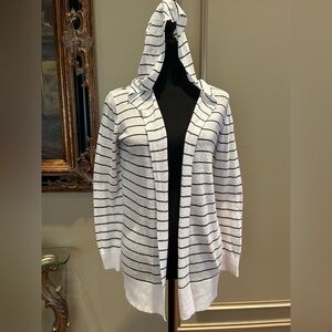 Cynthia Rowley cardigan, Cynthia Rowley hooded cardigan, Cynthia Rowley XS sweater, Cynthia Rowley striped cardigan, Cynthia Rowley layering sweater, black white striped cardigan, hooded striped cardigan, linen blend cardigan, lightweight cardigan XS, summer cardigan XS, spring cardigan XS, casual hooded cardigan, open front hooded cardigan, breathable cardigan XS, everyday striped cardigan, minimalist cardigan XS, travel layering sweater, beach cover cardigan, work from home cardigan, casual weekend cardigan, transitional weather sweater