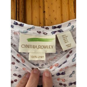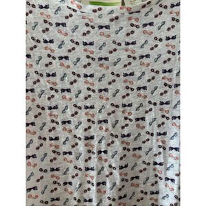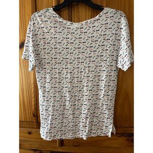 Cute linen tee with a bit of sheerness to the fabric. Pink, blue and purple sunglass print. Pit to pit measure is 18 inches. Length is 23 inches. Lots of stretch to the fabric.