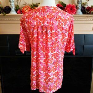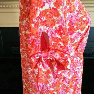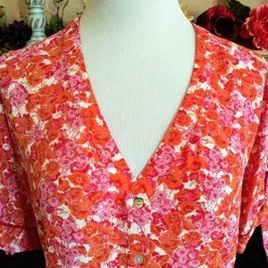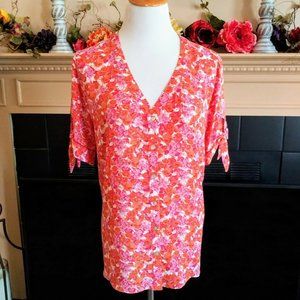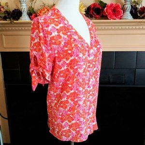 Cynthia Rowley Tie Sleeve Button Front Blouse XL Orange Pink Floral MOP Buttons