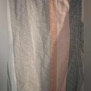 V-Neck / Faux Wrap / Stripes in pale Creams , pinks and grey / Flowing / High Low Effect shorter in front longer in back / No stains / Gently Worn